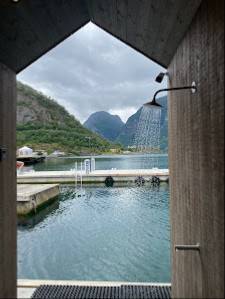 - Es gibt keinerlei Liegen, Stühle oder auch nur einen zusätzlichen Raum, um sich zwischen den Sauna Gängen aufzuhalten. Das Prinzip ist also: schön in der Sauna sitzen, im Fjord schwimmen, zurück in die Sauna.